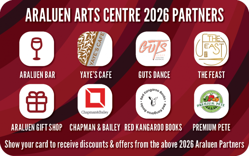 Exclusive offers and discounts with our 2026 Araluen Arts Centre Membership Partners; six generous local businesses that have partnered with Araluen Arts Centre to provide 2026 Araluen Members with these generous discounts: